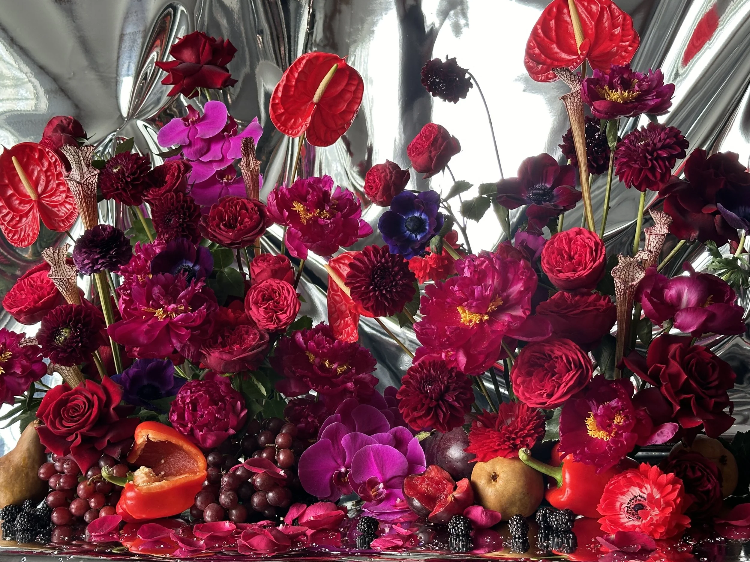 Introducing "HER" — the ultimate showstopper arrangement for that girl who deserves it all. This bold and breathtaking design features red roses reflexed to perfection, burgundy peonies stealing the spotlight, and burgundy cymbidium orchids adding a sultry touch. Purple Clooney ranunculus bring a pop of playful charm, while burgundy anthuriums and vibrant mokara orchids turn up the drama. All this floral fabulousness is cradled in a chic chrome ceramic vase that’s ready to dazzle any room. It’s a little flirty, a lot fabulous, and guaranteed to make hearts flutter!